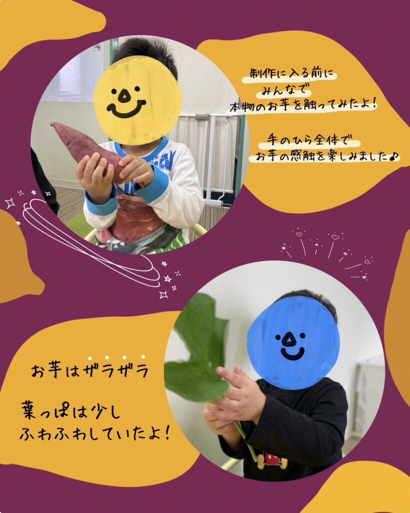 実物のさつまいもを触る体験では、転がしてみたり、葉っぱを頭の上に乗せてみたりとみんな大喜びでした☺️💕
